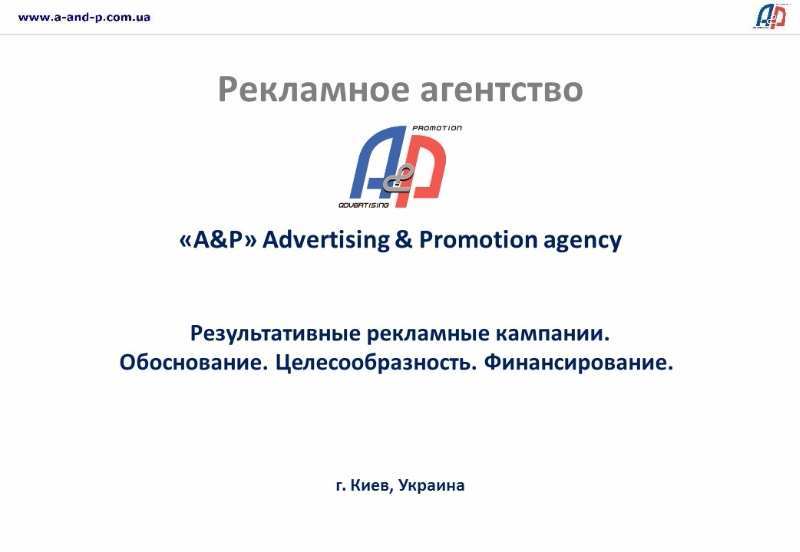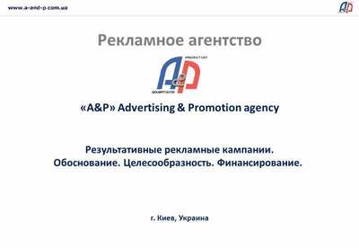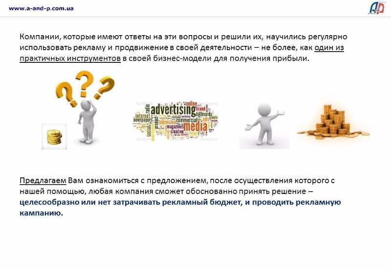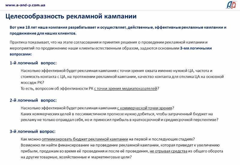 Вот уже 18 лет наша компания разрабатывает и осуществляет, действенные, эффективные рекламные кампании и продвижение для наших клиентов. Практика показывает, что на этапе согласования и принятия решения о проведении рекламной кампании и мероприятий по продвижению наши клиенты естественным образом, задаются основными 3-мя логичными вопросами: 1-й логичный вопрос: Насколько эффективной будет рекламная кампания с точки зрения охвата именно нужной ЦА, частота и стоимость контакта с ЦА, на протяжении рекламной кампании, качество контакта для отклика ЦА на основной мэссэдж РК? То есть, вопросом об эффективности РК с точки зрения медиапоказателей? 2-й логичный вопрос: Насколько эффективной будет рекламная кампания с коммерческой точки зрения? Каких коммерческих целей в пессимистичном прогнозе нужно добиться, чтобы затраченный бюджет на рекламу не только оправдал себя, но и приносил прибыль в краткосрочной и среднесрочной перспективе? 3-й логичный вопрос: Как можно оптимизировать бюджет рекламной кампании на первой и последующих стадиях? Возможно ли найти финансирование на проведение рекламной кампании, которая приведет к увеличению прибыли, продажам во время её проведения и после её проведения, не отрывая средства из общего оборота на другие товарные, хозяйственные и маркетинговые цели? Предлагаем Вам ознакомиться с предложением на нашем сайте, после осуществления которого с нашей помощью, любая компания сможет обоснованно принять решение – целесообразно или нет затрачивать рекламный бюджет, и проводить рекламную кампанию. Дополнительная информация на сайте a-and-p.com.ua