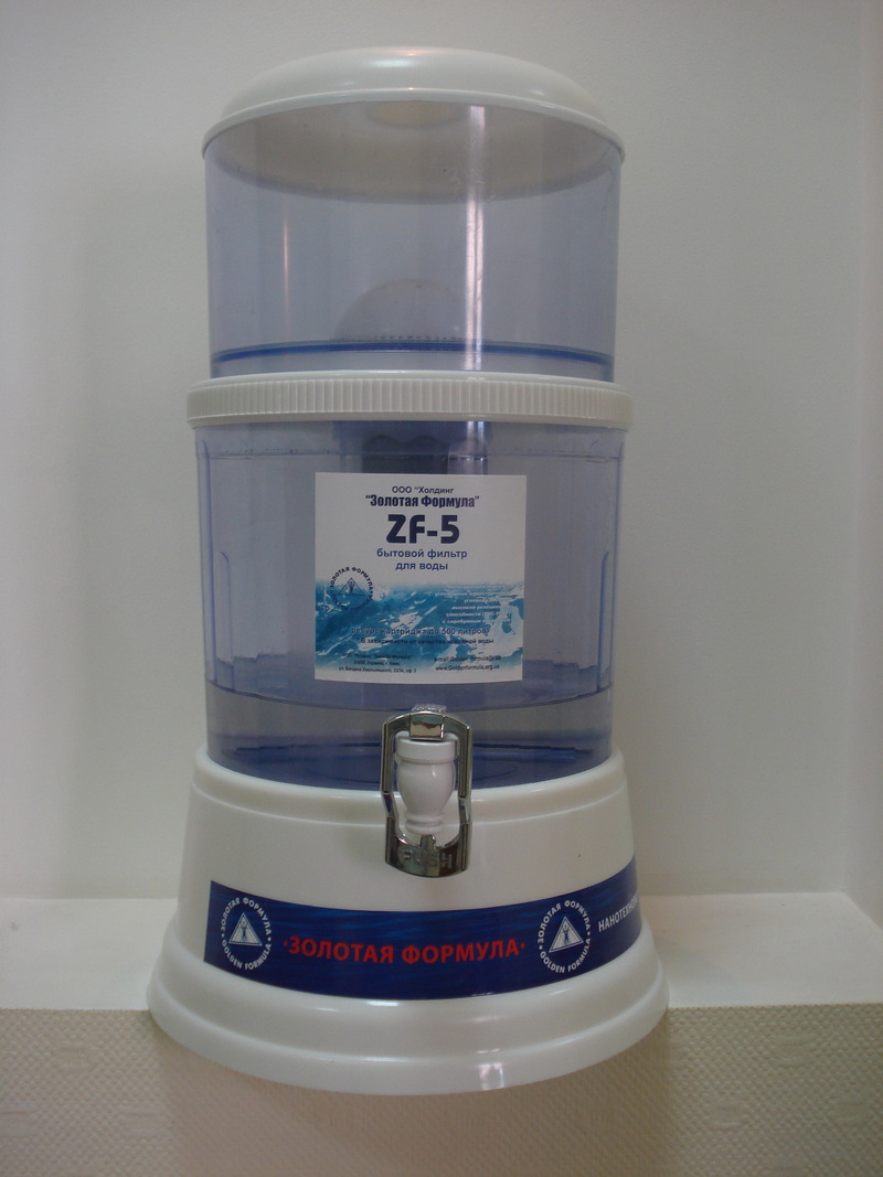 Фильтр «ZF-5» оснащен сменным картриджем и относится к категории настольных фильтров. В этом фильтре содержатся две емкости, одна из которой предназначена для отфильтрованной воды (7 литров), а вторая для приема воды для фильтрации (5 литров). Данный фильтр может применяться для ежедневного использования, как в офисе, так и в домашних условиях.Отфильтрованная вода обогащается калием, йодом и серебром, а также сохраняет вещества, которые полезны для организма человека.