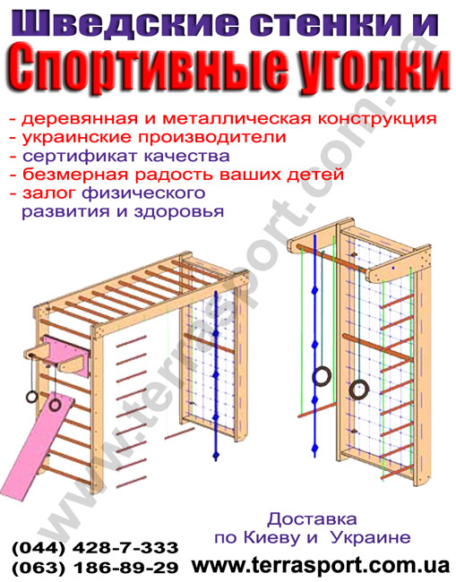 Даже малыш, совершающий первые шаги, с удовольствием начнет осваивать шведскую стеночку. Карабкаясь вверх, он постоянно будет массировать стопы ног, что является профилактикой плоскостопия. Играя на "лесенке", ваш малыш улучшит координацию движений, синхронизирует работу полушарий головного мозга, а повисев на перекладине турничка, ребенок будет лучше расти и развиваться - станут крепче мышцы рук, плечевого пояса, груди, спины, позвоночника и брюшного пресса. Занимаясь вместе с ребенком, Вы с легкостью сможете обойти проблемы в развитии позвоночника вашего малыша. Когда человек висит, напряжение с позвоночника снимается и проще выявить искривления.