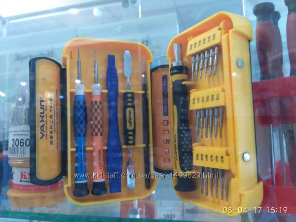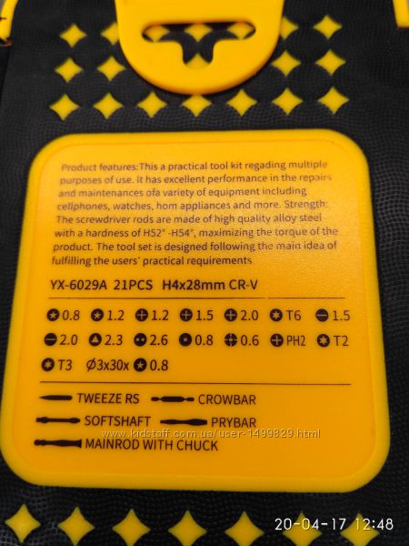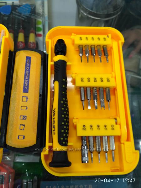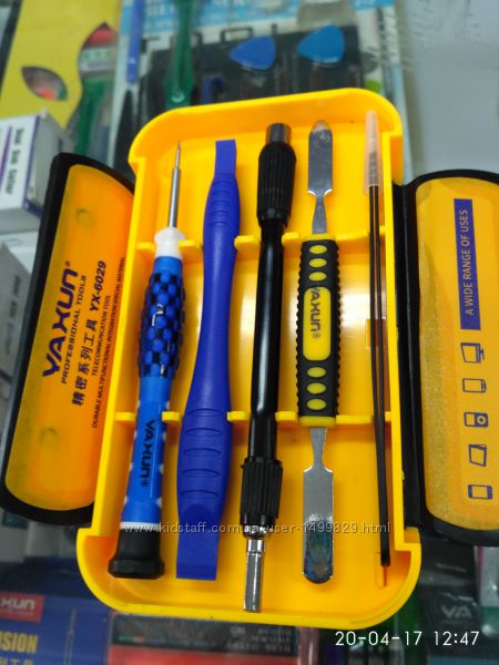 Профессиональный набор инструментов Yaxun YX-6029A создан прежде всего для ремонта различной электроники, мобильных телефонов, в том числе iPhone, iPad, MacBook и многих других предметов. Для iPhone в наборе имеется отдельная отвёртка Pentalobe 0,8 (также в комплекте бита Pentalobe 0,8). В наборе 21 предмет, полный список входящих в набор насадок и инструментов Вы можете увидеть на одной из фотографий. Материал бит CR-V.