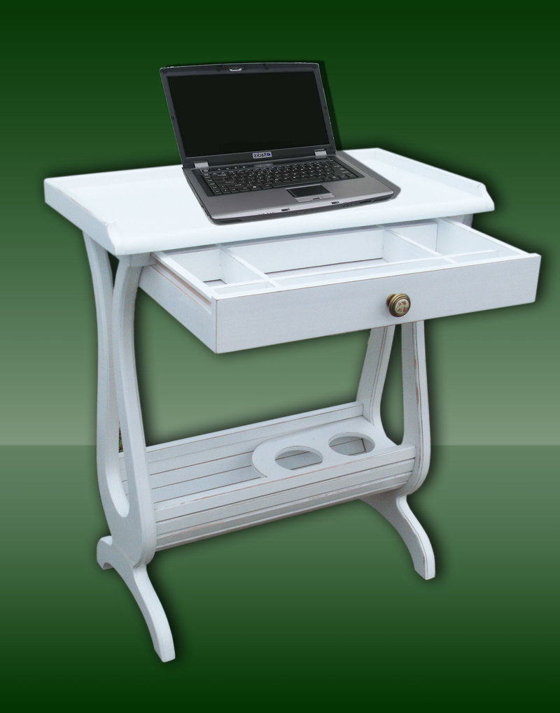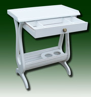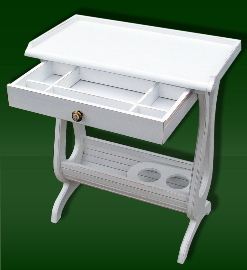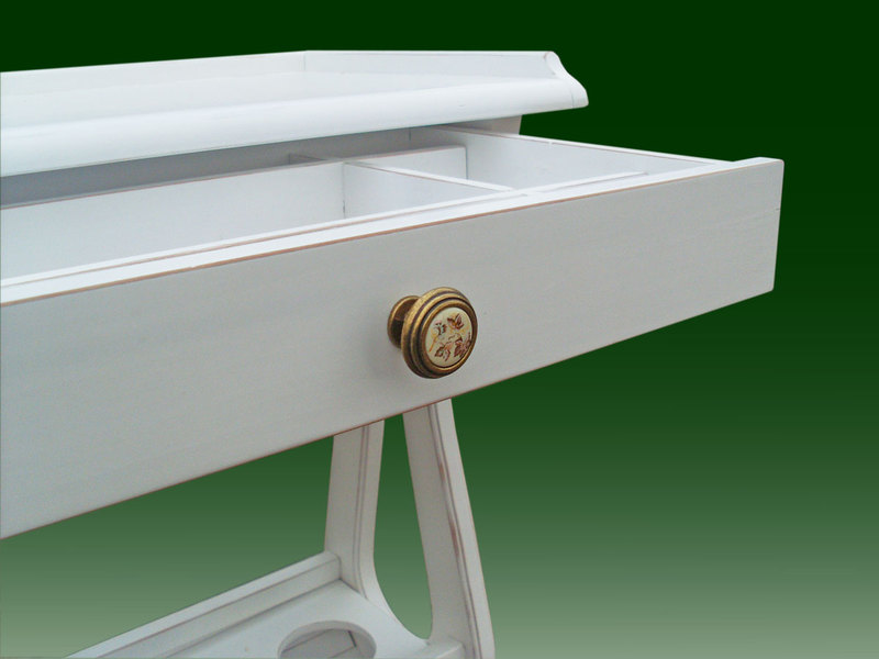 Небольшой столик в стиле "Прованс" с шухлядкой для хранения столовых приборов и держателем винных бутылок в нижней части. Может так же использоваться как столик для работы с ноутбуком и других целей. Изготовлен из дерева ольхи. Отделка - белая, матовая краска с характерными потертостями "Под старину". Размеры 720-630-340 мм Новое изделие. Возможно изготовление подобных вещей на заказ. |