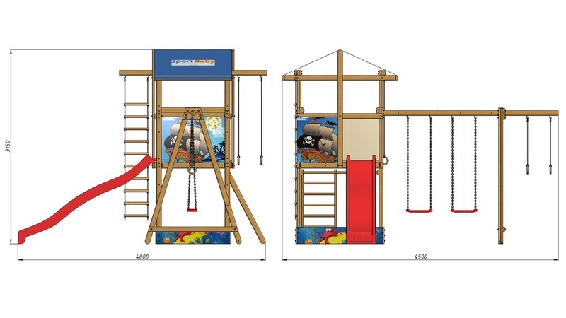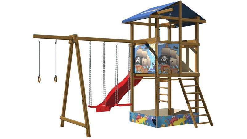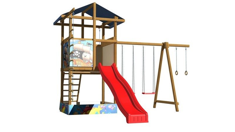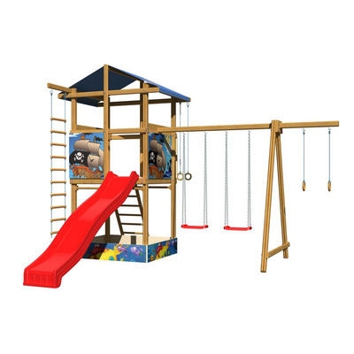 Такой комплекс устанавливают на детской площадке, на которой отдельно можно поставить качели-балансир и качели-карусель. Игровой комплекс оснащён лестницей (без поручней), подвисной лесенкой и двумя качелями, пластиковым трёхметровым спуском-горкой. Пластиковые детали декора и фотопечать стойкие к ультрафиолету и прекрассно выдерживают перепады температур.