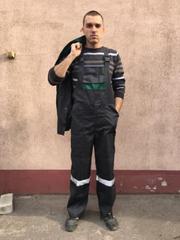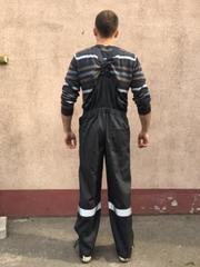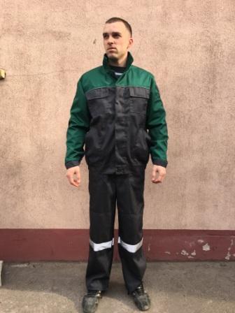 Костюм состоит из куртки и полукомбинезона . Комбинация цвета на куртке и полукомбинезоне - Серый и зеленый . Материал - ткань Саржа( повышенная прочность ткани ) плотность 245грм – состав хлопок 40 %