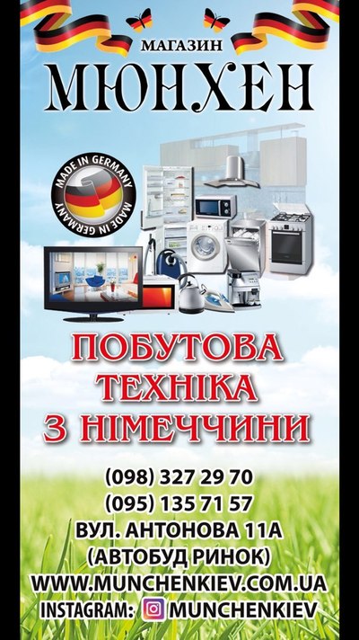 Бытовая техника в Ирпене. В наличии большой выбор бытовой техники из Германии: холодильники, морозильные камеры, стиральные и сушильные машины, духовые шкафы, варочные поверхности (газовые и керамические), плиты, микроволновые печи (СВЧ), пылесосы, хлебо-печки, телевизоры и т.д. У нас можно купить бытовую технику б/у из Германии в Ирпене. Доставка по Киевской области и Киеву нашим транспортом. Также работаем со всеми перевозчиками (Новая Почта, Ин Тайм, АвтоЛюкс, Деливери, Ночной Экспресс, Мист Экспресс и т.д.). Гарантия и после гарантийное обслуживание! Магазин "Мюнхен-Киев". "Техника из Мюнхена к Вам домой" INSTAGRAM: munchenkiev НАШИ САЙТЫ: munchenkiev.com.ua munchenkiev.olx.ua |