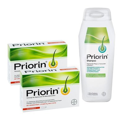 Пропоную пріорін виробництва Bayer Vital GmbH Німеччина. Особливістю даних продуктів є натуральний склад, завдяки якому відбувається живлення коренів волосся важливими мікронутрієнтами, сприяючи таким чином росту здорового волосся. Пріорін діє завдяки основним натуральним інгредієнтам: екстракту проса, вітаміну В5 (кальцію пантотенат), біотину і L-цистину.