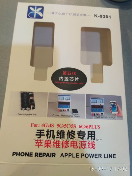 Набор кабелей K-9301 предназначен для включения Apple iphone 4, 4G, 4S, 5, 5S, 6, 6 Plus без аккумулятора с помошью источника питания.