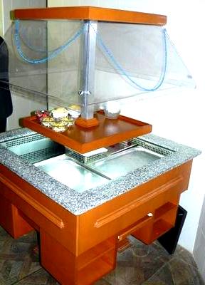 Витрины снабжены подсветкой. Прилавки выполнены их нержавеющей стали. Есть полки и шкафчики для хранения.