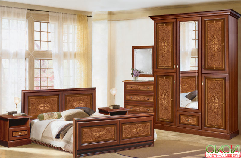 Корпус ДСП: Орех Караваджо , фасады МДФ резные, лакированные: Орех Лунгарно, зеркало с фацетной обработкой.
