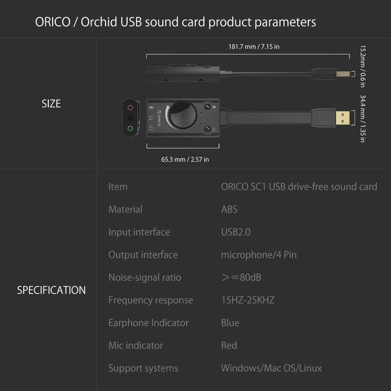 Внешняя звуковая карта ORICO SC1 оснащена USB интерфейсом. Такой разъем вы точно найдете на своем компьютере, ноутбуке или игровой приставке, поэтому с подключением проблем не возникнет.