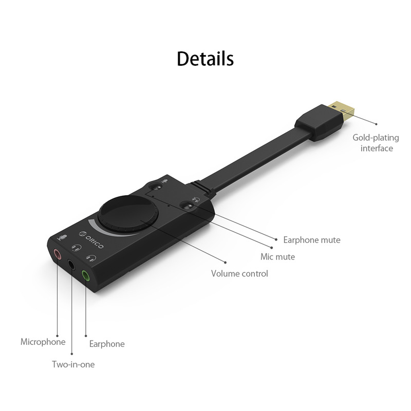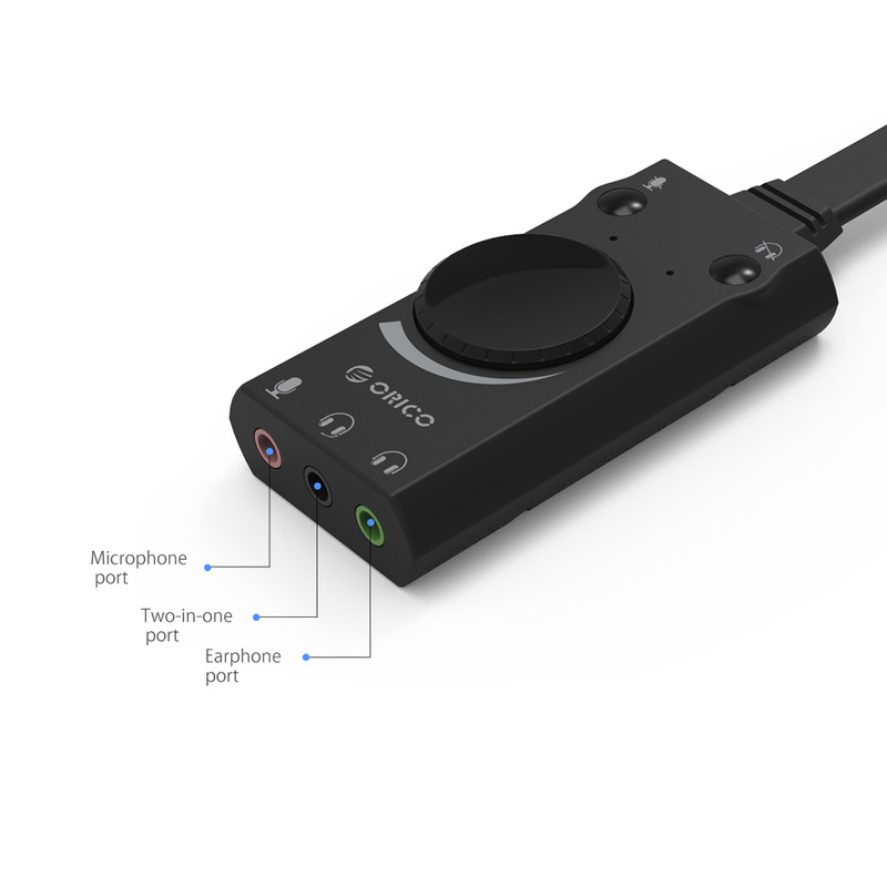 Тип устройства: Внешняя звуковая USB карта ORICO SC1 - независимые разъемы для микрофона, гарнитуры и наушников, стереозвук