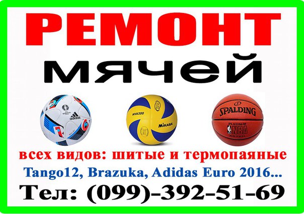 Стоимость и примеры выполненных работ смотрите в группе Вконтакте vk.com/remontball Любой ремонт Вашего мяча, как нового, так и игранного: - замена камеры, ремонт камеры мяча, ремонт швов, замена секции мяча, пайка швов, замена. - Ремонт клееных мячей !!! Опыт в ремонте мячей 20 лет !!! На работу и материалы предоставляется гарантия до 1 года. Также работаем с магазинами, спорт клубами, школами, институтами... На кол-во от 5шт скидки. Работаем по всей Украине |