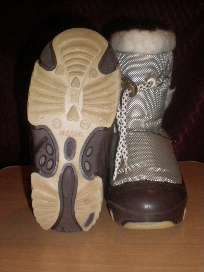 Продам ботинки зимние Demar (производство – Польша), подойдут как для девочки, так и для мальчика. На овчине, термо. Размер - 24-25, длина по стельке 14,5 см. Цвет – серебристый, подошва – коричневая с бежевым. Подошва пластичная и упругая, антискользящая, с защитной пяткой и носком, спереди на затяжке. В отличном состоянии. Цена – 250 грн. 096-400-26-52 Инна |