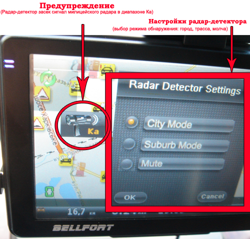 Навигатор и радар-детектор имеют совместное крепление, а так же кабель подключения навигатора и радар-детектора. Устройство может работать как совместно, так и отдельно друг от друга. С помощью кабеля подключения устройства соединяются между собой и синхронизируются во время работы. Во время синхронной работы при получении радар-детектором сигнала обнаружения милицейского радара на экране навигатора появляется ненавязчивое предупреждение, при этом звуковые сигналы самого радар-детектора можно отключить. Так же с помощью меню навигатора возможно изменять режимы приема сигнала радар-детектора.