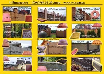 Продам бетонные изделия: накрытие бетонное на забор, парапет 2-х скатный, колпак бетонный, бордюр тротуарный, балясины из бетона, цветники, вазы, урны, столбик для парковки, лавочки. Парапет бетонный 2х скатный размеры: 160х1250мм 130х470мм 180х500мм 220х1250мм 250х370мм 270х390мм 275х1000мм 250х1250мм 265х1250мм 300х500мм 300х1250мм 350х390мм 350х500мм 350х1250мм 400х620мм 390х1250мм 420х1250мм 460х500мм 460х1250мм 530х1300мм 580х1250мм 630х1200мм и еще много размеров есть или сделаем индивидуально под Ваш заказ. Тел.: (096) 769-35-29. Анна. Дополнительная информация на сайте vvi.com.ua |