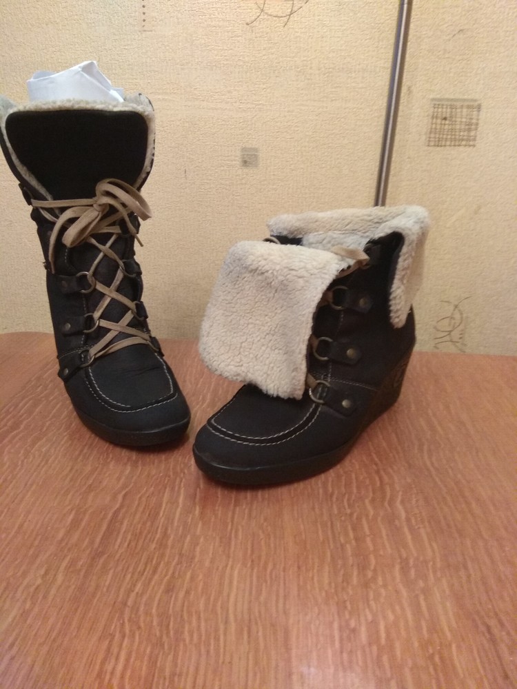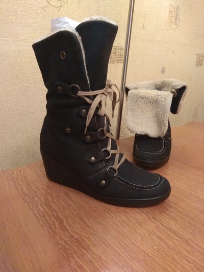 Состояние - б/у, Размер - 38, 39 Высокие ботинки отличного качества. Натуральный замша, внутри овчинка. Стелька 25 см. Высота 26 см. Высота платформы 6 см. Можно носить по разному. На фото показала. |