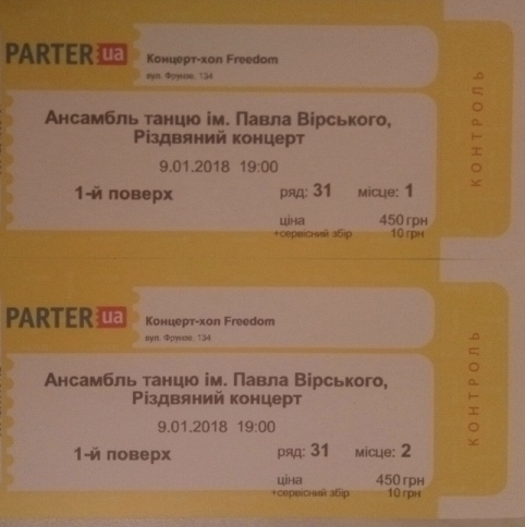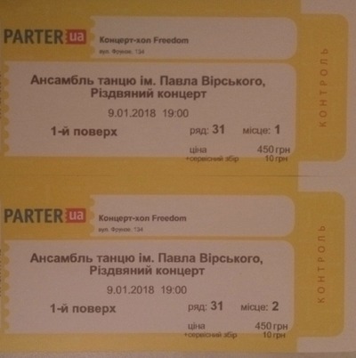 Продам два квитки на концерт ансамблю танцю ім. П.Вірського в Києві у FREEDOM Event Hall по 450 грн |
