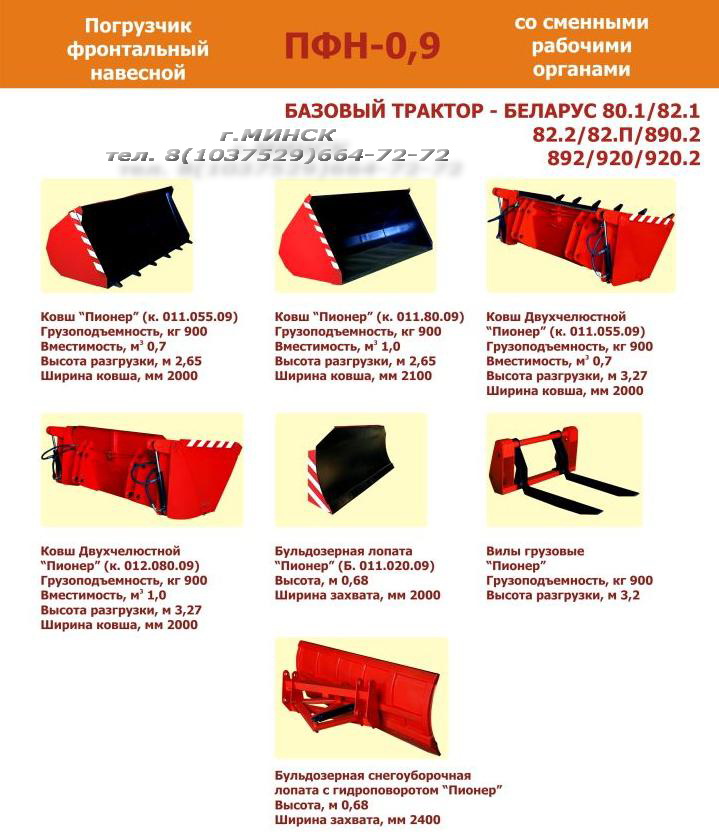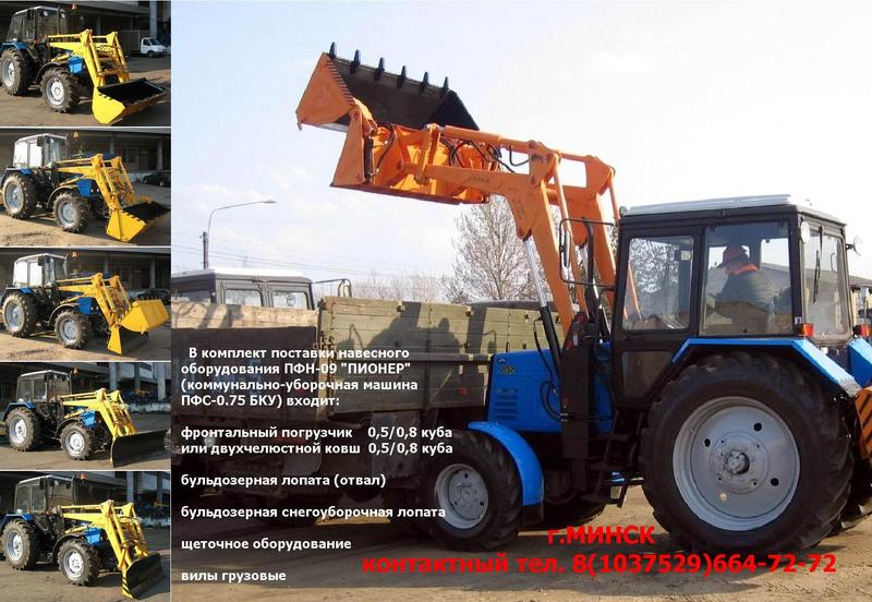 Погрузчик фронтальный навесной ПФН-038М (г/п 750 кг), ПФН-09М (г/п 1350 кг). Базовый трактор МТЗ-82.1, МТЗ-82.1-23/12, МТЗ-92П или др.