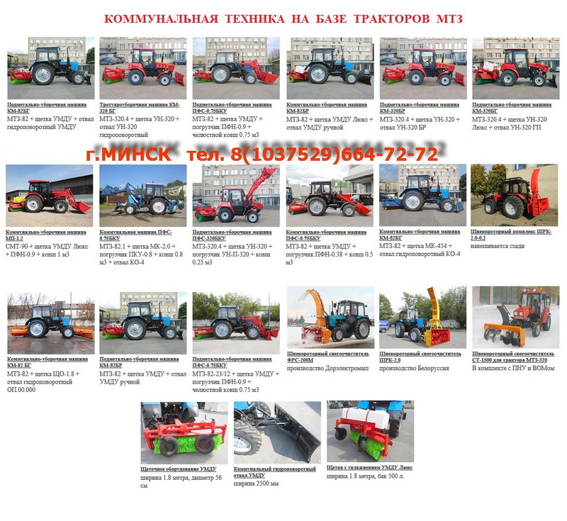 ● дорожно-строительная и коммунально-уборочная техника на базе тракторов: МУ-320 (Беларус 320МК; КМ-320БР), МП-320 (Беларус 320П04; ПФС-320Б), МПУ-320 (Беларус МУП-320; ПФС-320БКУ), машина уборочно-погрузочная ПФС-075БКУ (Беларус МУП-351), машина коммунальная КМ-82, Беларус 82МК, фреза дорожная ФД-567, ДЭМ-121, шнекороторный комплекс ШРК, ДЭМ-124 и др.