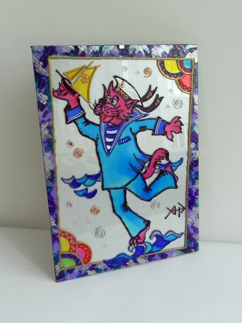 Размер живописного поля: 150 х 210 (мм). Витражная картина выполнена витражными красками и контурами по стеклу. В современной анти-раме без каркаса. Яркая пёстрая сине-фиолетовая рамка по краю изображена специальными красками по керамике. Подложка - специальная серебристая плотная бумага нежного тона. Отлично будет смотреться в интерьере как в детской так и в гостиной комнате. Будет хорошим подарком для детей и взрослых. Возможна экспозиция вместе с картиной "Морской Волк". Мои картины обрели счастливых хозяев не только в разных городах Украины и СНГ,но и в США и Германии. Присоединяйтесь! |