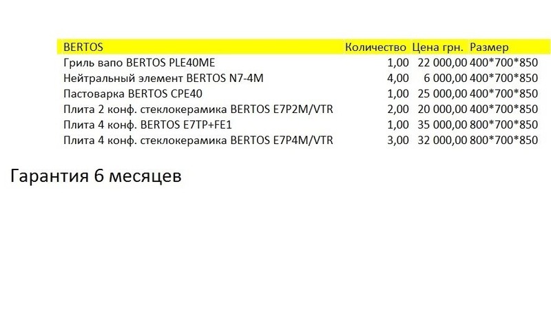 Продам плиту стеклокерамическую б/у. Плита стеклокерамическая б/у в хорошем состоянии, есть несколько штук в наличии. Плита стеклокерамическая б/у корпус выполнен из высококачественной нержавейки. Также есть другие изделия этой марки б/у. Посмотреть и забрать можно в Киеве на складе или доставим курьерскими службами Украины. Длина 700 мм Ширина 800 Высота 900 Количество конфорок 4 Максимальная температура ТЭНА 500С° Мощность Вт 10000 Напряжение В 380 Сталь AISI 304 Страна производитель Италия Гарантия 6 месяцев |