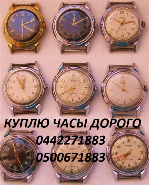 Куплю часы наручные, карманные, каминные, напольные, настенные. Таких моделей Алмаз, Ракета, Слава, Полет, Старт, Спортивные, Луч, Зим, Свет, Заря, Маяк, Юность, Чайка, Звезда, Москва, Восток, Колос, Амфибия, Юношеские, Командирские, Победа, Родина, Секунда, Корнавин, Кировские, Янтарь. Секундомеры, технические часы, браслеты и цепочки для часов. А также приобретаем другие предметы старины: книги, картины, награды, иконы, фарфор, самовары, изделия из серебра и золота, янтарные и коралловые бусы и прочее. Достойная оплата. Он-лайн оценка на сайте https://awangard.kiev.ua 0500671883 0442271883 |