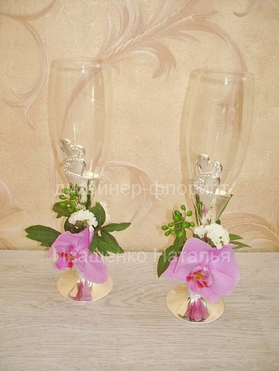 Оформление бокалов цветами под заказ в Киеве, самые нежные, романтические украшения живыми цветами под стиль Вашей свадьбы. Украшение бокалов от 200грн. Точную цену озвучит менеджер по т.0673668735 Наталья. г.Киев |