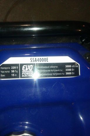 продам бензиновый генератор Состояние новое был в работе только в проверке на мото счетчике все видно полное название evo ssa 4000e , хорошая и не заменимая вещь в строительстве или при частом выключении света ! |