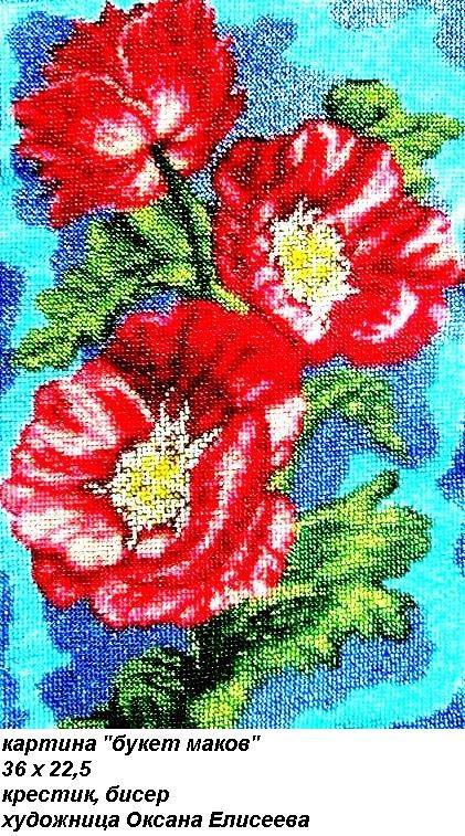 картина букет маков - ручная работа, вышита крестиком. размер - 36 на 22,5 см. художница - Елисеева Оксана Федоровна. |