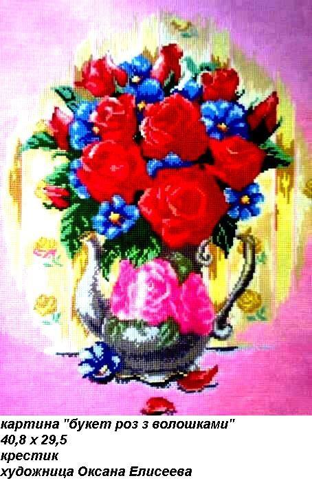 картина букет роз с волошками - ручная работа, вышита крестиком. размер - 40,8 на 29,5 см. художница - елисеева оксана. |