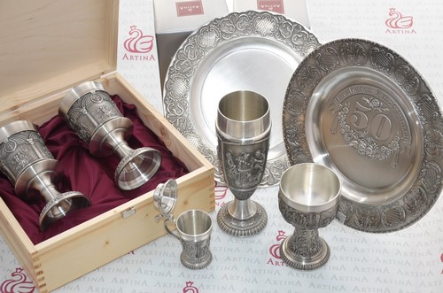 Подарочные товары для декорирования дома: часы, настенные тарелки, подсвечники, вазы из стекла и олова, оловянные фигурки животных и растений, музыкальные шкатулки, оловянные подносы для фруктов и овощей, чайные стаканы с оловянными подстаканниками, фоторамки, графины, кувшины. Подарки на юбилей: бокалы, фужеры для вина, коньяка, шнапса, водки с «40», «50», «60», «65», «70», подарки на свадьбу.
