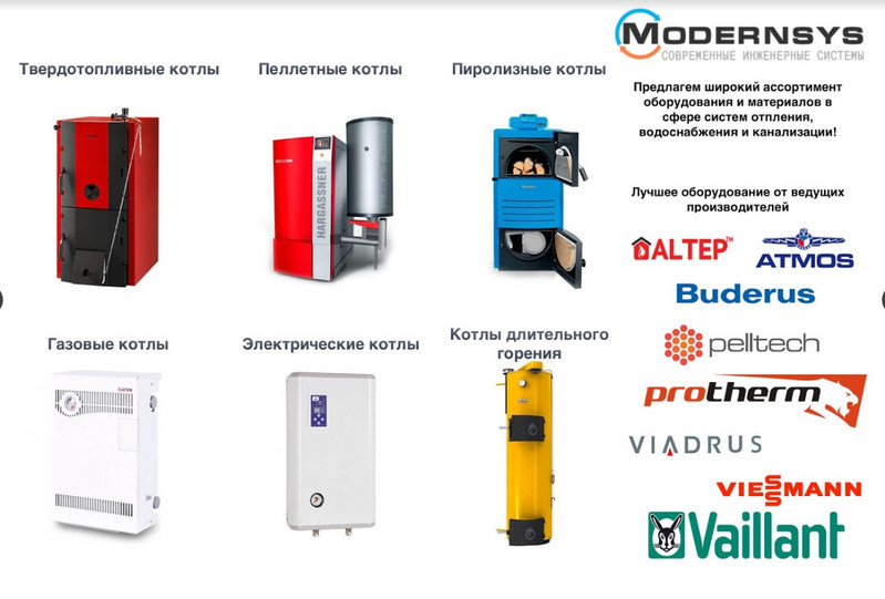 Интернет-магазин MODERNSYS предлагает широкий ассортимент оборудования и материалов в сфере систем отопления, водоснабжении и канализации! *** Лучшее оборудование ведущих производителей! Altep, Atmos, Buderus, Caldera, Dani, Pelltech, Protherm, Stropuva, Termomont, Viadrus, Viessmann, Vaillant и др. *** Большой выбор котельного оборудования: • Твердотопливные котлы - Классические твердотопливные котлы - Универсальные с автоматической подачей - Пеллетные котлы - Пиролизные котлы - Котлы длительного горения - Твердотопливные котлы с плитой • Газовые котлы • Электрические котлы • Теплоаккумуляторы, гидроаккумуляторы и водонагреватели *** На сайте предоставлено боле 150 тысяч товаров: • Отопительные радиаторы и конвекторы. • Трубы и фитинги, трубы для наружной канализации, теплые полы. • Насосное оборудование – для отопления и охлаждения, водоснабжения и канализации. • Изоляция и крепежи, солнечные установки, камины, автоматика для систем отопления! *** Наши преимущества: • Консультируем по материалам и оборудованию! • Изготовляем проектную документацию! • У нас только качественное и сертифицированное оборудование! • Постоянно действуют акции и спец. предложения • Для постоянных клиентов бонусная программа лояльности • Для монтажных компаний имеем спец. предложения *** Предоставляем дополнительные услуги по Монтажу отопления, Киев и обл.: От изготовления проекта до монтажа котельных, радиаторов, теплых полов! Доставка по всей территории Украины. Удобной для Вас компанией грузоперевозки! *** 0800 33 19 24 https://modernsys.com.ua
