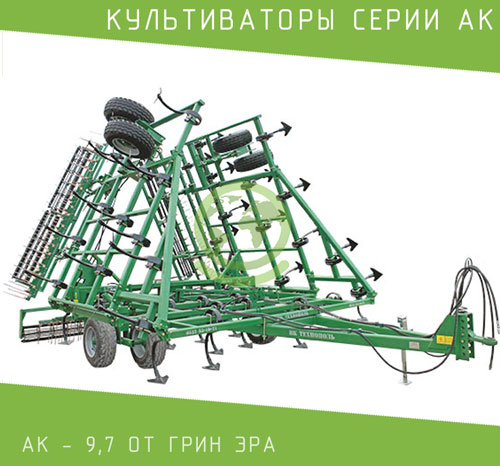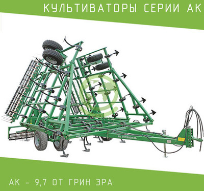 Культиваторы серии АК – 9,7 — универсальные, широко захватные, предназначены для ресурсосберегающей предпосевной и паровой культивации почвы, подрезания и вычесывания сорняков, а также выравнивания и уплотнения поверхности почвы под посев. Преимуществом агрегата является перепускные цилиндры, гидрозамок регулировки глубины обработки, которые в совокупности позволяют производить регулировку с максимальной точностью без дополнительных усилий. Применяется на всех видах почвы за счет своей универсальности в виде множества регулировок самого культиватора и его навесного оборудования. Рабочая ширина захвата 9,7 метра. Вы можете ознакомиться со всей продукцией фирмы ГринЭра, заглянув в каталог, и купить не только культиватор, но и другую технику.
