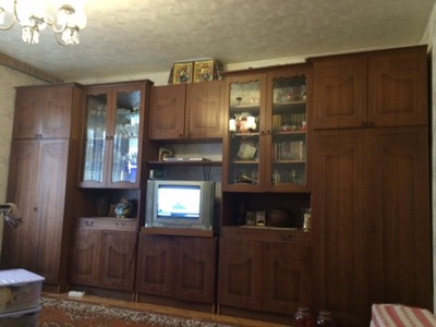 Стенка в нормальном состояние стоит в гостиной .нужно на тумбочках поменять магниты и некоторые ручки.в сервантах есть выездные тумбочки делённые на пополам и снизу большие ящики.один шкаф со стангой,второй делённый на пополам штанга и полки,вместительные антресоли (полка),тумбочка под телевизор. Будут вопросы пишите или звоните.отвечу,сброшу дополнительные фото.Можно купить часть стенки.Длина всей стенки 4.2м,состоит из 5 секций по 0,84 м которые можно комбинировать как вам удобно,Высота 2.25 м. |