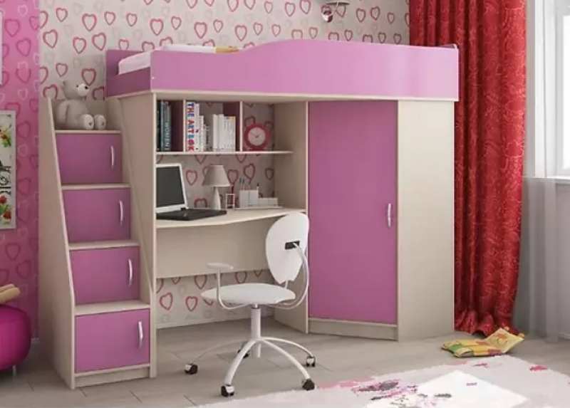 Данная кровать имеет два яруса. Она идет с лестницей, также есть комод. Все что нужно совмещено в одной недорогой модели.