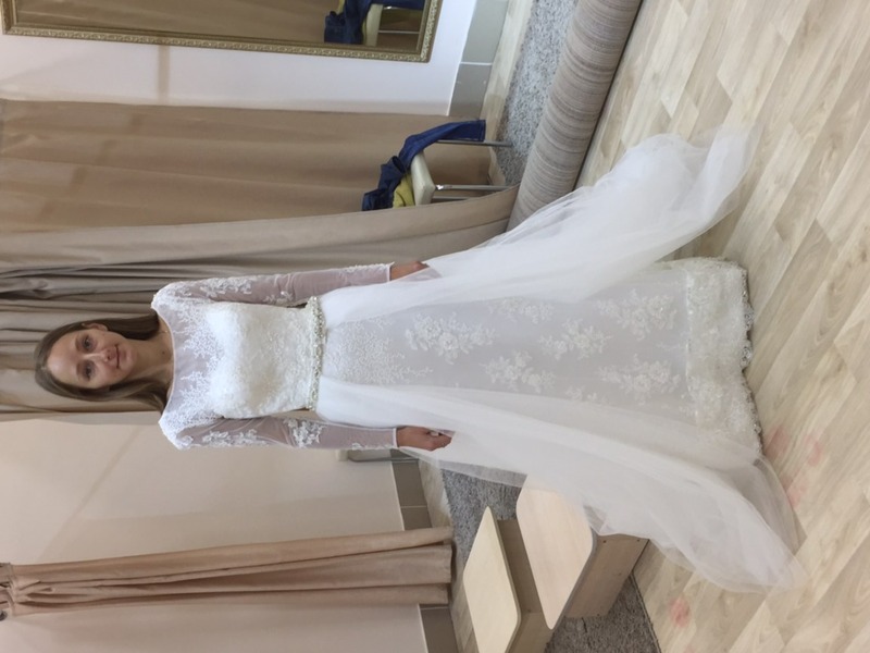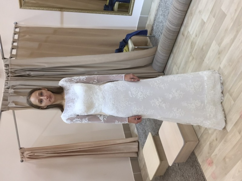 Свадебное платье рыбка трансформер с длинным рукавом. Юбка пристёгивается на пуговичку,в любой момент вы можете её снять,то что очень удобно,не мешает и не пачкается. Шлейф в платье не очень блинный и тоже подстёгивается. Размер S-XS. Город Киев. |