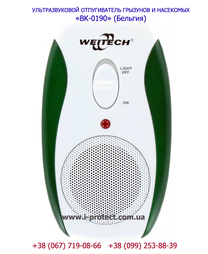 Красивый и экономный прибор устранит мышей, крыс и тараканов с кухни, кладовки или одной комнаты площадью до 90 м2. Weitech ВК 0190 влияет на животных только акустическим образом — без ядов и химикатов. Безопасен для людей и всех живых существ в любом отношении. Имеет функцию ночного светильника, что вместе с современным внешним видом делает эту модель отличным приобретением для жилых помещений. Эта модель — новинка 2018 года и она отличается в лучшую сторону от конкурентов следующим: