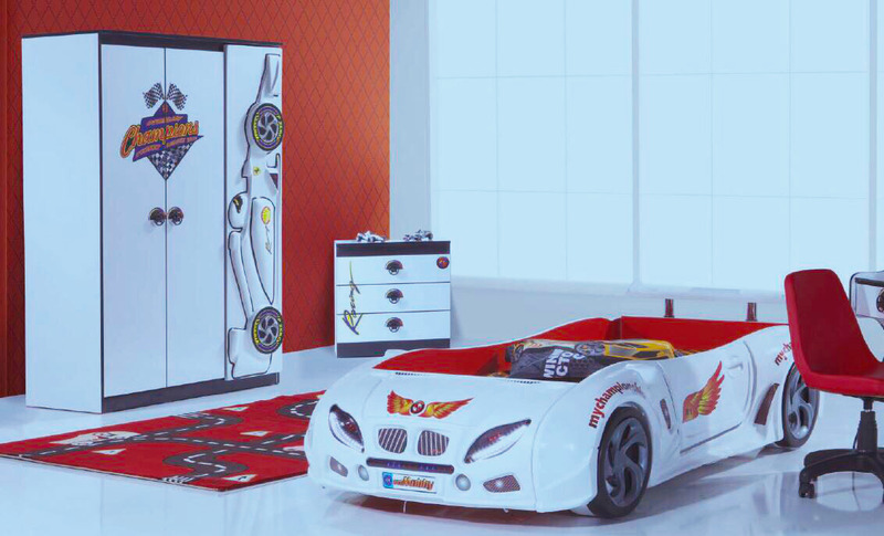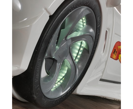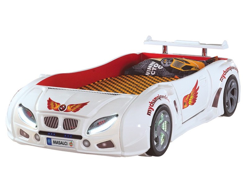 Детская кровать в виде машины очень похожа на БМВ и представляет собой объемную конструкцию, которая производится из безопасного ABS ― пластика, путем термопласт обработки. Обтекаемые формы и круглый бока не только привлекательно смотрятся, но безопасны в эксплуатации в детской комнате. Колеса кровати пластиковые, объемные, не съемные. Светятся фары и бегущая полоса на фасаде.