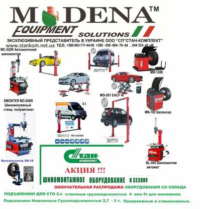 На сегодняшний день происходит распродажа шиномонтажного оборудования, двухстоечных и ножничных подъемников пр-ва MODENA EQUIPMENT: