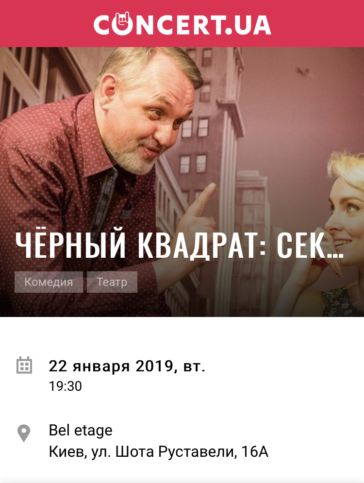2 билета на спектакль Черный квадрат «Сексом дружбу не испортишь» 22 января Места: 2 ряд, 8-9 места https://concert.ua/ru/event/chernyi-kvadrat-seksom-druzhbu-ne-isportish?pageType=amp |
