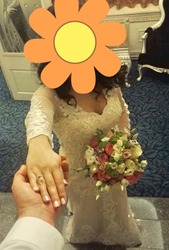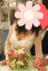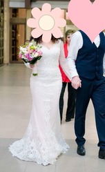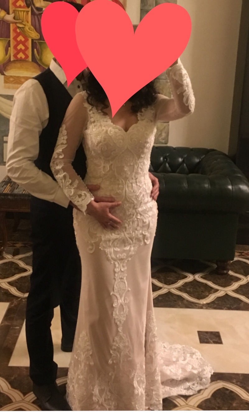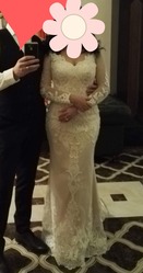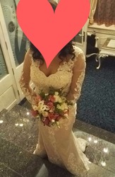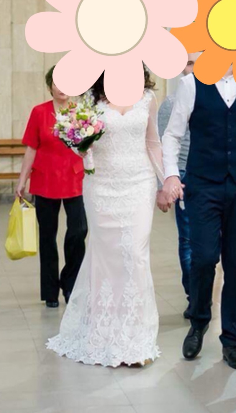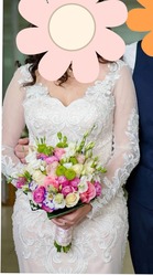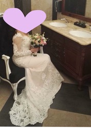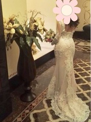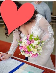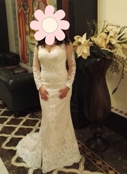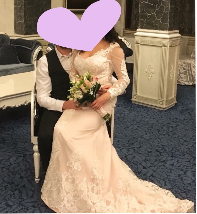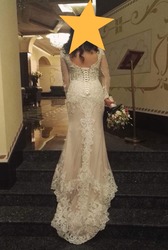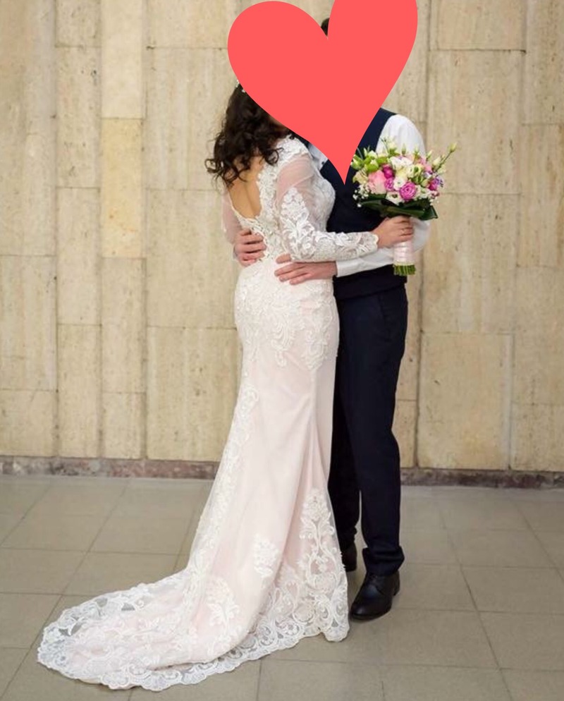 Шила на заказ по своим меркам. В свадебном салоне-ателье. Ручная работа! Платье шикарное, в живую смотрится конечно гораздо эффектней, чем на фото. Платье идеально подходящее для свадеб в осенне-зимнее время. С длинным рукавом. При желании все конечно можно перешить и смоделировать и без рукава. Подкладка - нежно розового цвета, грудь открыта, без сеточки, спинка открыта, сзади небольшой шлейф, шлейф пристегивается на кнопочку сзади, по спинке до бедер идет шнуровка.