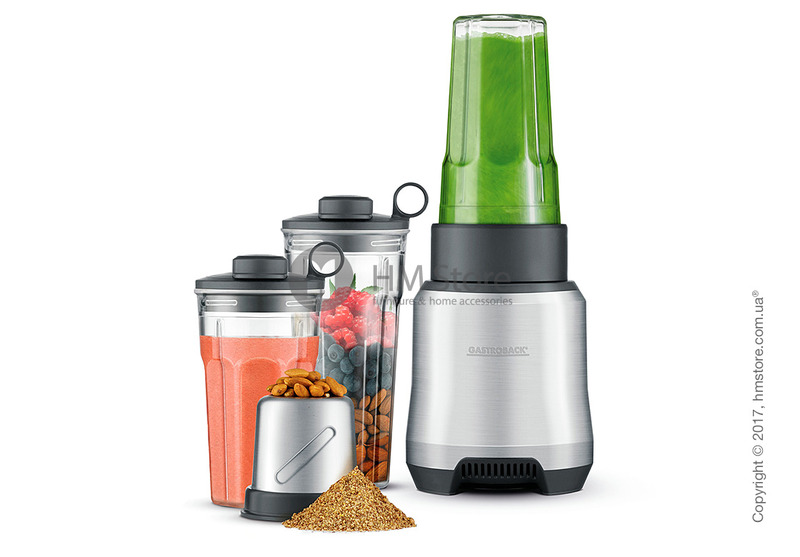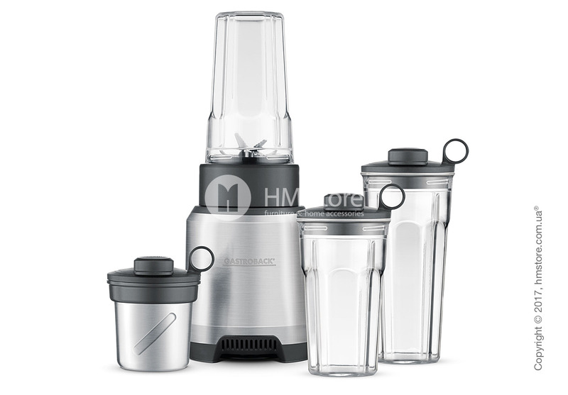 Gastroback Design Personal Blender Pro станет ярким и многофункциональным аксессуаром в Вашем кухонном пространстве. Гладкая поверхность и простая расцветка дополняется мощным двигателем и множеством удобных и полезных параметров. Ножи высокого качества и идеальный по форме кувшин поможет вам смешать любые ингредиенты. В комплекте находятся 2 пластиковых стакана, стакан из нержавеющей стали и 2 крышки, с клапанами для питья, так вы сможете брать напиток с собой на пробежку, прогулку или на работу. Такая кухонная машина совершенно проста в управлении. Кроме того блендер не будет мешать вашей работе на кухне, так как благодаря литому металлическому корпусу, он будет неподвижно стоять на столе, не создавая вибраций.