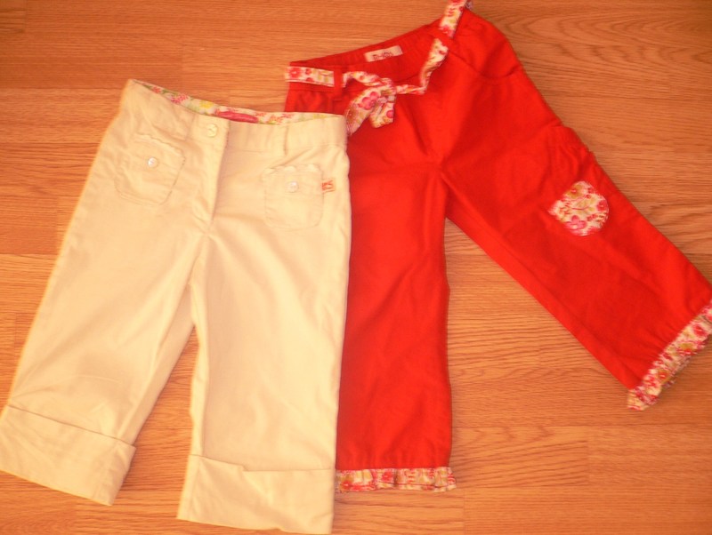 Красные штанишки (на рост 98 см), куплены в Антошке: длина штанины 48 см, по внутреннему шву 32 см. Штанишки на резиночке, с ярким цветочным пояском. Состав 100% хлопок. 70 грн Каприки Sela из коллекции Sweet Summer (3 года): длина штанины 44,5 см, по внутреннему шву 27 см. Талия 27см, можно уменьшать, так как внутри регулируется за счет резиночки на пуговках. Состав: 98% коттон, 2% спандекс. 70 грн Все в идеальном состоянии. За 2 вещи 100 грн. |