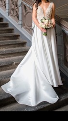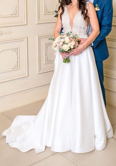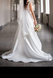 Есть шлейф, и пришиты пуговки под поясом для его подстёгивания, т.е. перемещаться можно свободно,а для фото отстегивать шлейф. Также, отдаю в подарок шубку молочного цвета ( искусственную) и кофту-накидку под платье(более легкую, для помещения). Подшивалось под рост 165 плюс каблук. Платье и шубка после химчистки, отдали сразу после свадьбы, в идеальном состоянии. Дополнительную информацию могу написать в Вайбер и обсудить в телефонном режиме. |
