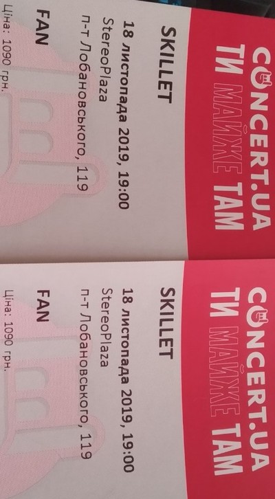 Есть 2 билета на концерт Skillet, который состоится 18 ноября 2019 года в Киеве. Билеты были куплены по ошибке, потому хотелось бы передать людям, которым интересно данное событие |