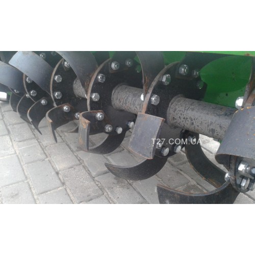 Рабочий орган представляет собой сплошной вал с 8-ю жестко установленными дисками. Ножи изогнутой формы (по 6 шт. в каждой секции, изготовлены из легированной стали) входят в грунт под определенным углом, что позволяет легко справляться с обработкой различных типов почв, контролировать нагрузку основных рабочих механизмов фрезы в сцепке с трактором. При помощи гидравлики трактора, а также благодаря специальным отверстиям, расположенным на салазках агрегата, можно производить регулировку глубины.
