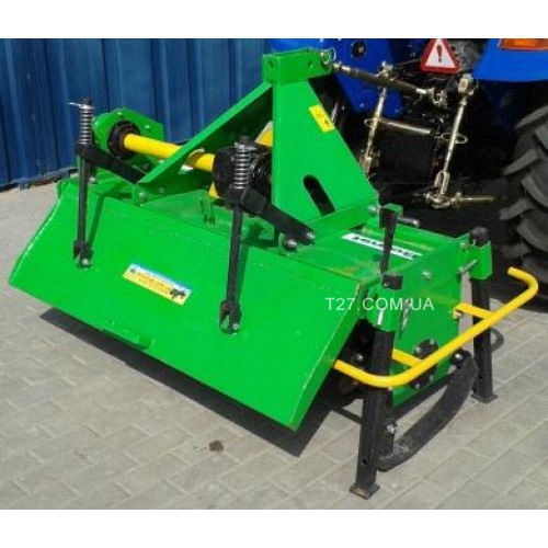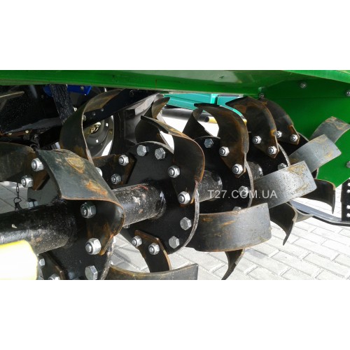 Рабочий орган представляет собой сплошной вал с 6-ю жестко установленными дисками. Ножи изогнутой формы (изготовлены из легированной стали) входят в грунт под определенным углом, что позволяет легко справляться с обработкой различных типов почв, контролировать нагрузку основных рабочих механизмов фрезы в сцепке с трактором. При помощи гидравлики трактора, а также благодаря специальным отверстиям, расположенным на салазках агрегата, можно производить регулировку глубины.