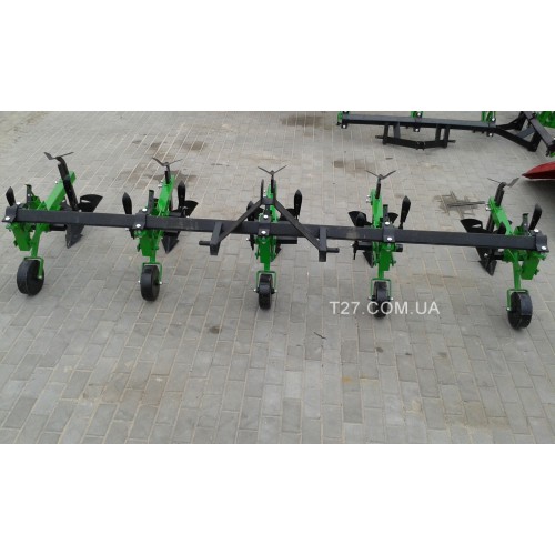 Максимальные нагрузки при работе выдерживает сплошная прочная металлическая рама с 5-ю рабочими секциями. В каждой секции предусмотрено место для крепления рабочей лапы при использовании культиваторов-ежей. Съемные элементы (окучники, рабочие лапы, рыхлители) удерживаются на секциях крепежными соединениями, благодаря чему можно регулировать глубину обработки почвы отдельно для каждого рабочего элемента. Равномерное заглубление всего агрегата обеспечивается опорными колесами и демпфирующими пружинами на секциях. Регулировка ширины междурядий (в диапазоне до 75 см) производится с помощью крепежных элементов, соединяющих секции и раму.
