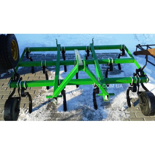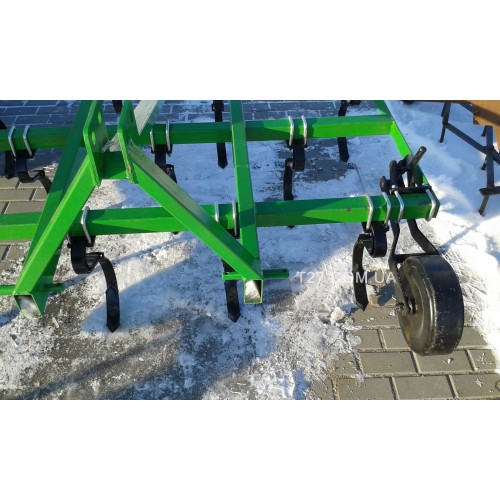 Прочная сплошная рама корпуса и продольная металлическая балка выдерживают большие нагрузки, гарантируя долговечность эксплуатации. Зубья (11 пружинных стоек) культиватора расположены в три ряда и крепятся к раме с помощью стремянок. В зависимости от цели обработки пружинные лапы легко меняются на рыхлительные долота и наоборот. При необходимости можно регулировать расстояние между рабочими элементами.