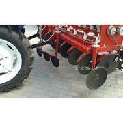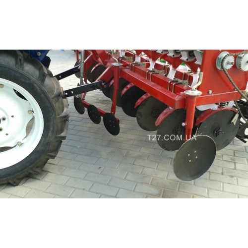 Главная конструктивная особенность орудия - наличие бункера для удобрений, что вносятся в грунт одновременно с семенами, но на уровень ниже, для благоприятного развития корневой системы и роста. Опорные колеса нарезают борозду регулируемой глубины. Равномерность посева обеспечивается специальными одноуровневыми шлангами, которыми оснащена сеялка.