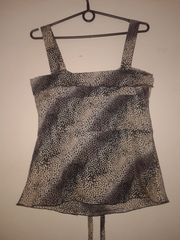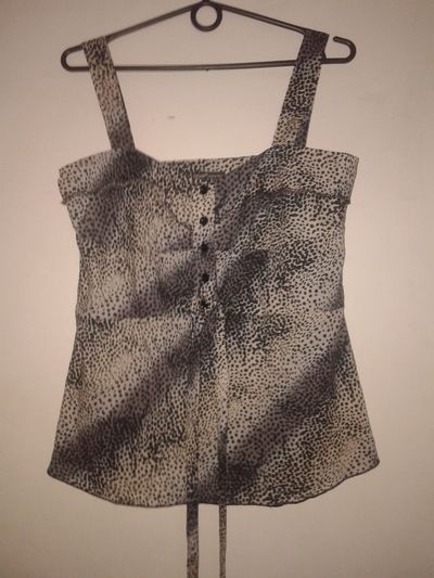 Топ, топик OGGI Впереди сверху застегивается на пуговицы. Под грудью завязывается на поясок. Ткань натуральная 100% хлопок. Цвет серо-белый в черные крапинки. Размер М Цена 120 |